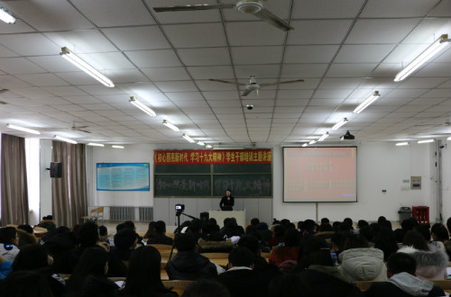 讲座开展前的一周,邓雨巍书记开始深入调查学生对十九大精神的了解情况,与学院教师们进行多次会议商讨,如何将十九大精神、习近平新时代中国特色社会主义思想带入校园,学生干部积极配合老师工作,带领学生们在课余时间建立小组共同探讨学习十九大精神。每日黄昏过后,邓书记的办公室里总是灯火通明,彻夜修改稿件,为在讲座中更全面的向学生们传达党的十九大精神做着充分准备。她围绕在新时代进程中擦亮初心、在民族复兴中坚守初心、在自我革命中砥砺初心三个视觉角度,就大学生如何理解习近平新时代中国特色社会主义思想进行了深入浅出的生动解读。