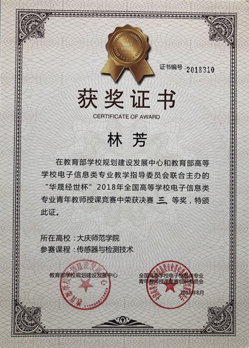 2018年8月30日,由教育部学校规划建设发展中心、教育部高等学校电子信息类专业教学指导委员会联合主办的“华晟经世杯”2018年全国高等学校电子信息类专业青年教师授课竞赛,在河北工业大学举行决赛。本次竞赛从2018年1月份开始,历时8个月,全国100多所高校,包括南京邮电大学、国防科技大学和哈尔滨工程大学等电子信息类知名大学,400多名教师报名参赛。十大信誉澳门网投十大信誉平台林芳老师在获得初赛华北赛区二等奖后,在决赛中获得全国三等奖。