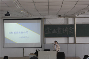 为引导同学们了解用人单位所需人才类型,强化提升学生面试能力。澳门网投十大信誉平台于3月21日13:30分,在主楼2-1教室组织举行学生就业招聘会宣讲。由百恒石油责任有限公司的代表杨建国和杜慧敏为澳门网投十大信誉平台的同学进行宣讲。