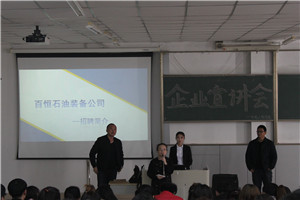 位于黑龙江省安达市安达开发区的百恒石油装备有限责任公司,注册资金高达一亿元人民币。该公司建有多个产业园区,为石油天然气开发等方面技术难题提供了专业的方法。公司立足于“科技创新,以创新带动发展,以发展带动利益,以人文与教育有机结合”的理念,立志成为百年企业,为社会和国家的发展,提供力量,在历史的长河中,激流勇进,创造辉煌。两位科技公司的代表就公司背景、公司文化以及公司现状等为同学们做了详细介绍,并对澳门网投十大信誉平台的就业前景以及学员需要掌握的基本技能做了分析。两位代表也热心地为同学们推荐了适合同学学习的学习方法,在会上两位代表通过现场提问的方式提高了同学们的兴趣,获得同学们的一致好评。同时,在场多位同学与百恒石油责任有限公司完成了就业协议的签订。