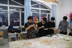 在联欢会中,最暖心的就是可爱的老师们。老师们放弃了和家人团聚的机会,选择陪在学生身边,实在可敬。各班班主任亲自和同学们包饺子,辅导员老师为各班同学们送上蓝莓酒,增添了年味。党总支书记高玉芝、学生党支部书记邓雨巍亲自走到各班送去祝福以及披萨,与同学合影留念。