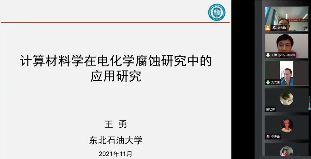 2021年11月16日下午,东北石油大学材料系教授、博导,黑龙江省级领军人才梯队后备带头人王勇教授受邀作题为“计算材料学在电化学腐蚀研究中的应用研究”学术讲座。讲座采用腾讯线上会议形式举行,澳门网投十大信誉平台副院长刘开绪教授主持,澳门网投十大信誉平台、化学工程学院教师及学生等60人参加。