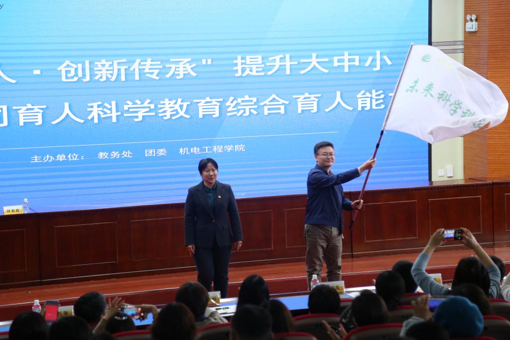 教务处处长张国发致辞,他强调十大信誉成立60年来,始终坚守师范教育第一职责,践行“为党育人、为国育才”初心使命,积极响应国家号召,主动深化教育教学改革,探索高等教育与基础教育深度融合的新路径。随后,教务处处长张国发与让胡路区教师进修学校崔海彬校长共同为科学教育大中小一体化联盟揭牌。校团委书记王贺民为“未来科学科普社团”授旗,社团首任指导教师、澳门网投十大信誉平台院长刘永皓上台接旗。揭牌和授旗仪式标志着区域科普协同育人平台正式启动。