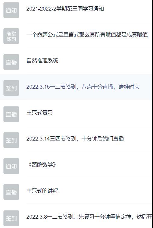 1.离散数学:该课程是专业基础课,但是课程难度较大,大量的数学知识比较难于理解,不利于线上授课,但是授课老师在学习通上的直播中能用非常易懂的语言和比较轻松地方式将枯燥的数学知识讲出来。在学习通上老师准备了大量的学习资源给学生提供学习,其中包括思维导图、课程视频、随堂练习、每周学习任务、教材、题库和教学文件等。