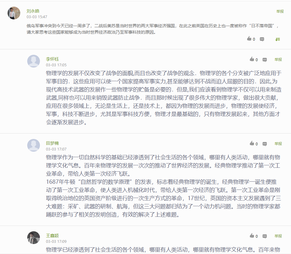 2、课前设置有关本节课的讨论题,特别是一些应用性的问题,然后通过自主学习,及课上讨论,有效体现了知识的实用性,提升了学生的应用能力。其中,有的老师还设置了一些时事问题,使学生能够从社会发展的角度,思考物理学的作用。增强了学生的学科认同感及使命感。