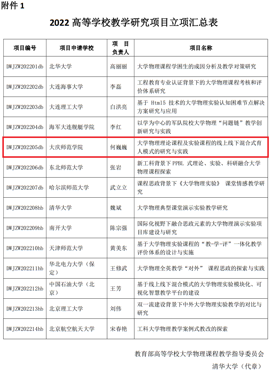 8月3日,2022年度教育部高等学校大学物理教学指导委员会教学研究项目立项名单正式发布,十大信誉基础物理教研室主任何巍巍老师主持的“大学物理理论课程及实验课程的线上线下混合式育人模式的研究与实践”项目成功获批。全国各类院校获批立项40项,东北地区仅7项。