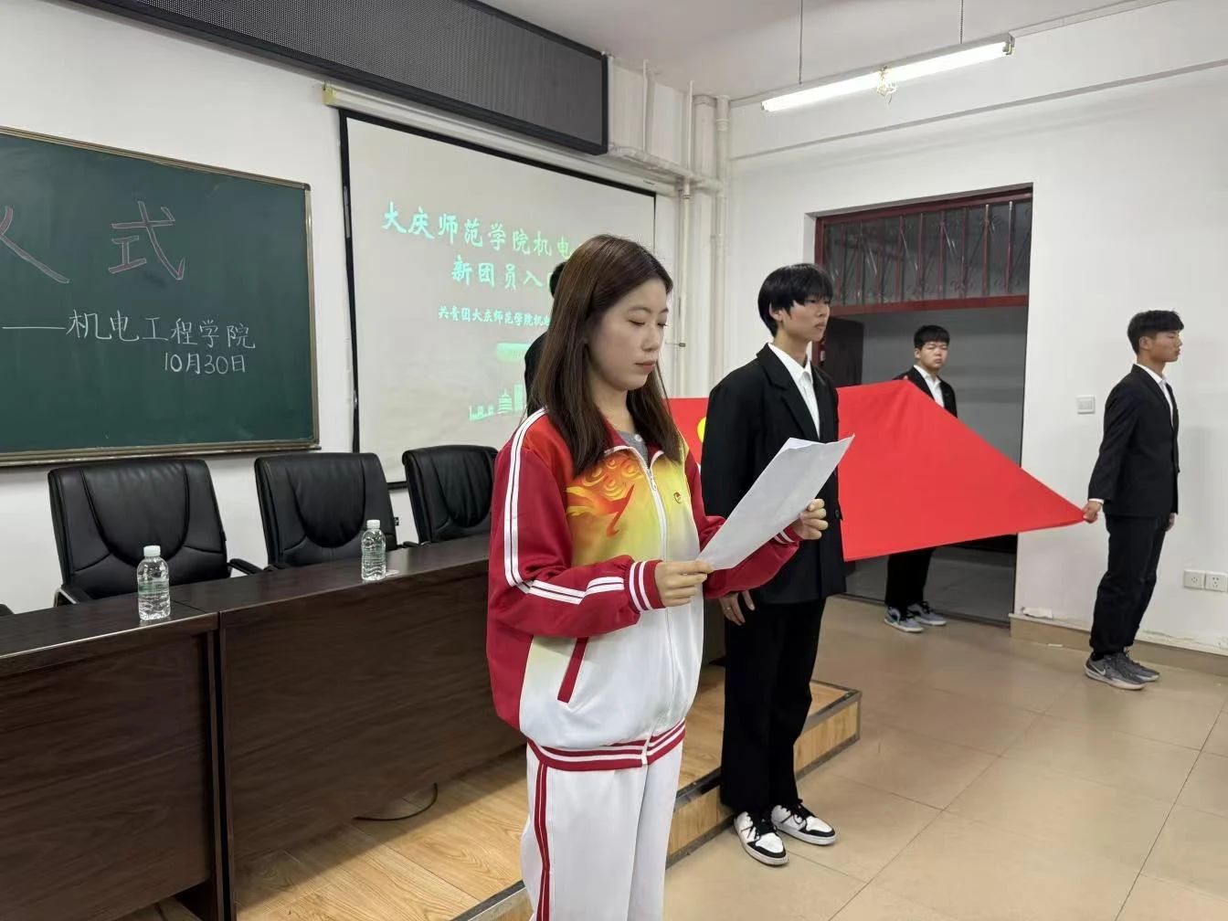 为深入贯彻习近平新时代中国特色社会主义思想,进一步继承和发扬共青团优良传统,增强团组织的凝聚力,增强新团员的荣誉感、归属感。澳门网投十大信誉平台于2024年10月30日在综合楼306教室举行2024年下半年新团员入团仪式。曲晓磊老师和新老团员代表参加此次活动。