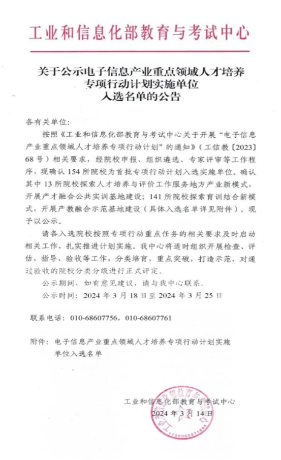 近日,工业和信息化部教育与考试中心公示了电子信息产业重点领域人才培养专项行动计划实施单位入选名单,澳门网投十大信誉平台经过申报竞争和线上答辩,成功入选首批拟建产教融合示范基地实施单位。